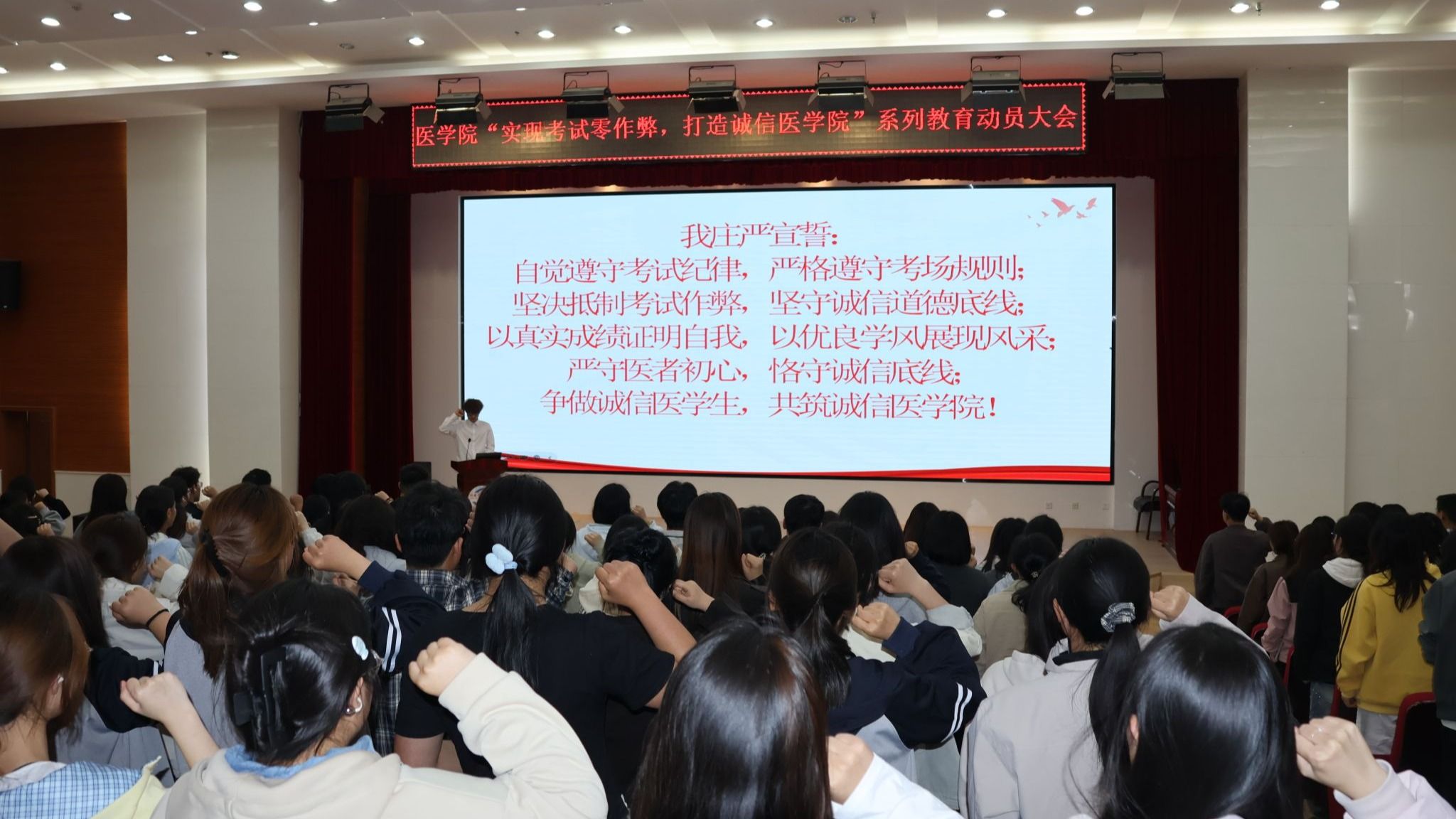 4月20日,学院召开“实现考试零作弊,打造诚信医学院”系列教育动员会。学院负责人,教科办、学工办负责人,班主任代表、全体辅导员及各班班长、团支书、学习委员等270 余名学生骨干参加。